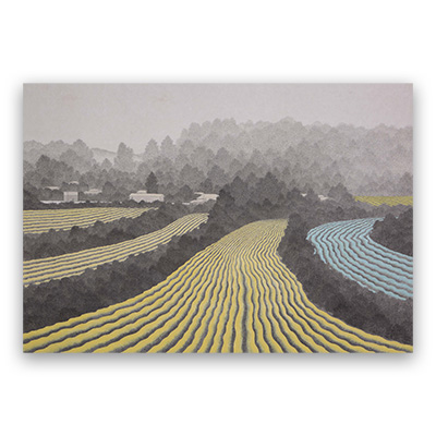 수행을 하는 마음으로 나뭇잎 하나하나 다 그리고 나면 마치 수확을 얻는 기분으로 논밭 위에 채색을 해나간다. 나뭇가지 하나 보일 틈 없이 빽빽하게 군집된 나무 숲은 묵묵히 논밭을 지키며 서있고, 생명이 숨쉬는 땅에는 밝고 화사한 기운이 넘쳐난다. 예전에 보았던